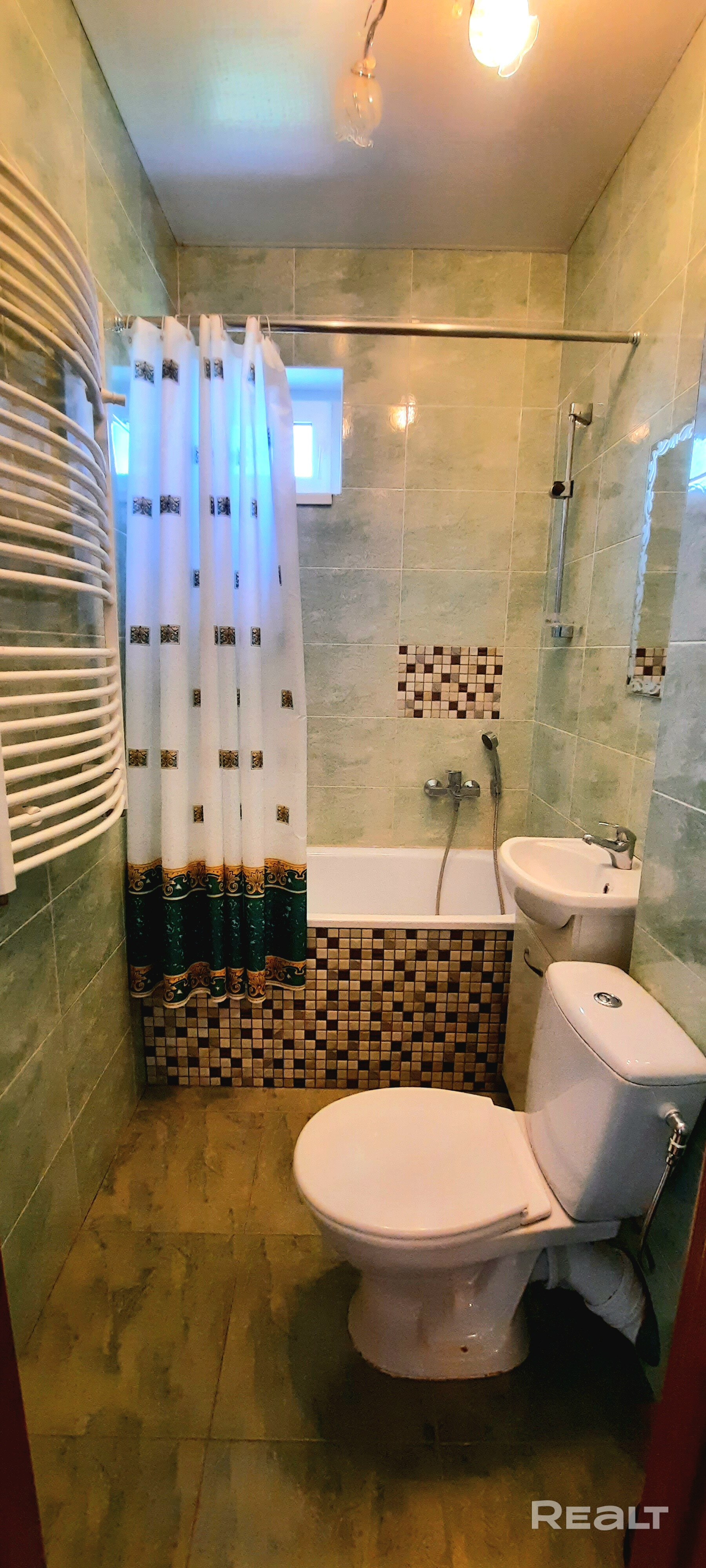 Небольшой, хорошенький санузел с мини ванной, умывальником и унитазом.