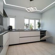 Кухня оборудована стильным гарнитуром, укомплектована всей необходимой бытовой техникой. Столешница из натурального камня.