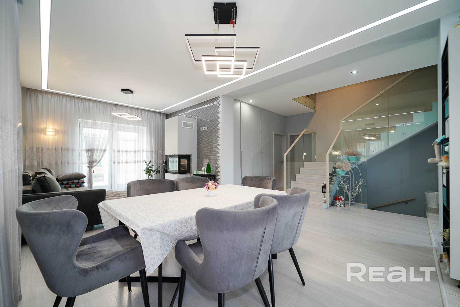 Дом состоит из 4 спален (3 из которых с гардеробной), гостиной с камином, кухни, топочной, 2 санузлов, душевой, комнаты отдыха, хоз. Помещения и сауны.