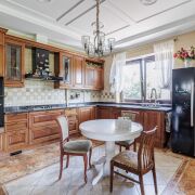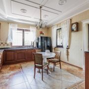- кухня оборудована фирмой «Артдеко». Фасады – «вишня». Встроенный холодильник «Либхер». Техника в кухне: Сименс и Бош. Дополнительный холодильник большого размера.