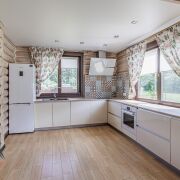- 22 см цилиндрованное бревно через жгут с 50 мм межвенцовым утеплителем Вилатерм в тёплом шве из акрилового герметика Remmers, звукоизоляция между этажами, 2х камерные деревянные стеклопакеты с атермальным стеклом, входные двери с терморазрывом, межкомнатные двери – массив.