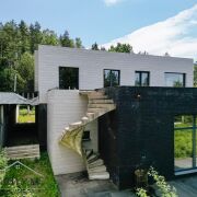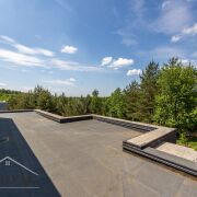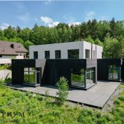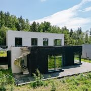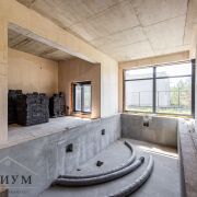 В доме видовое панорамное остекление и высокие потолки. Запроектировано место под камин. 3 спальных комнаты, 1 гостевая на первом этаже, просторная кухня-столовая, гостиная. Банный комплекс с бассейном, парной и хамамом и зоной отдыха.