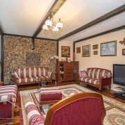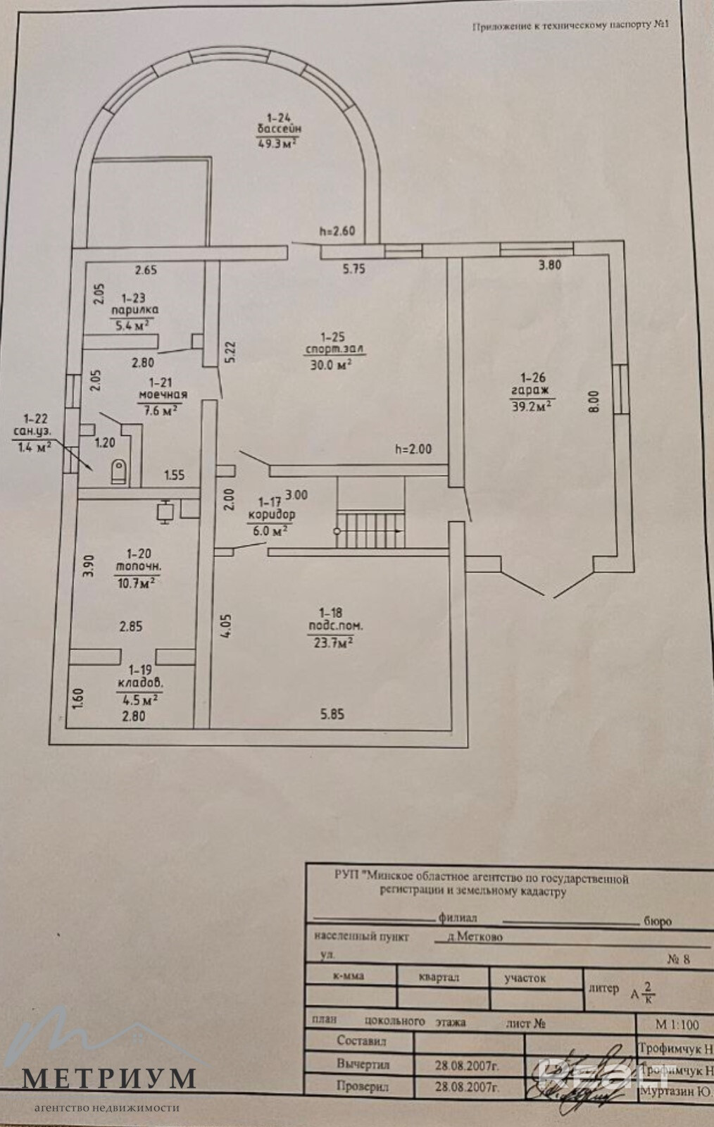 На цокольном этаже расположены: спортзал 30 кв.м, баня с бассейном 49 кв.м., дополнительный гараж для автомобиля 39 кв. Общая площадь дома 397 кв.м):