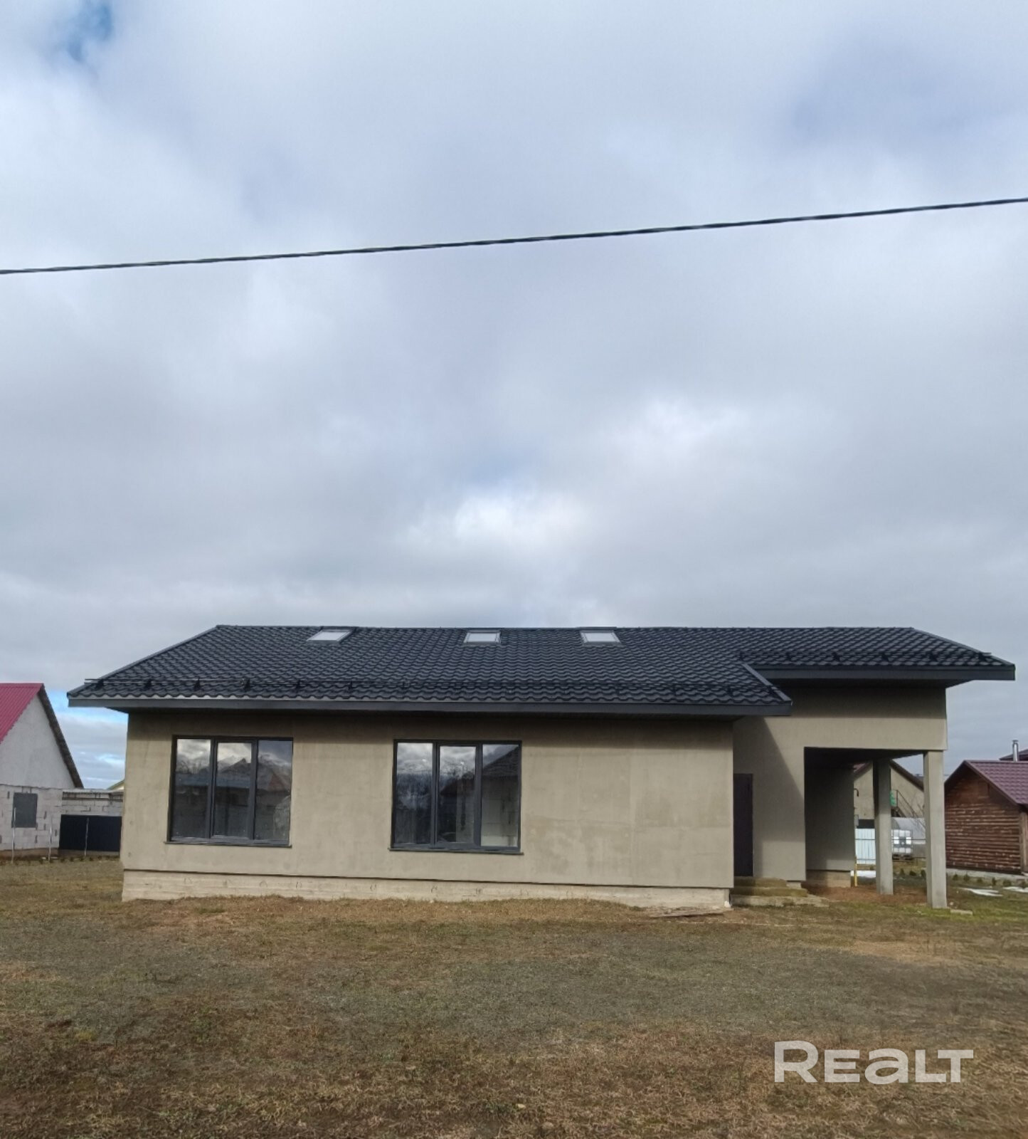 Стены дома утеплены и оштукатурены.