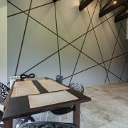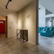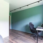 Массивная лестница из металлического каркаса, привлекает внимание своей формой и выступает как отдельный архитектурный элемент. На втором этаже две изолированные комнаты, которые можно организовать как детские. Окна выходят на сторону, где участок граничит с лесополосой. Санузел оборудован душевой кабиной. Под скатом крыши организовано просторное помещение для хранения.