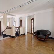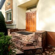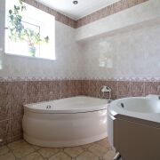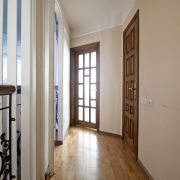 На полу керамическая плитка и дубовый паркет, переходящий в удобную лестницу из дуба, межкомнатные двери из массива с дорогой фурнитурой.