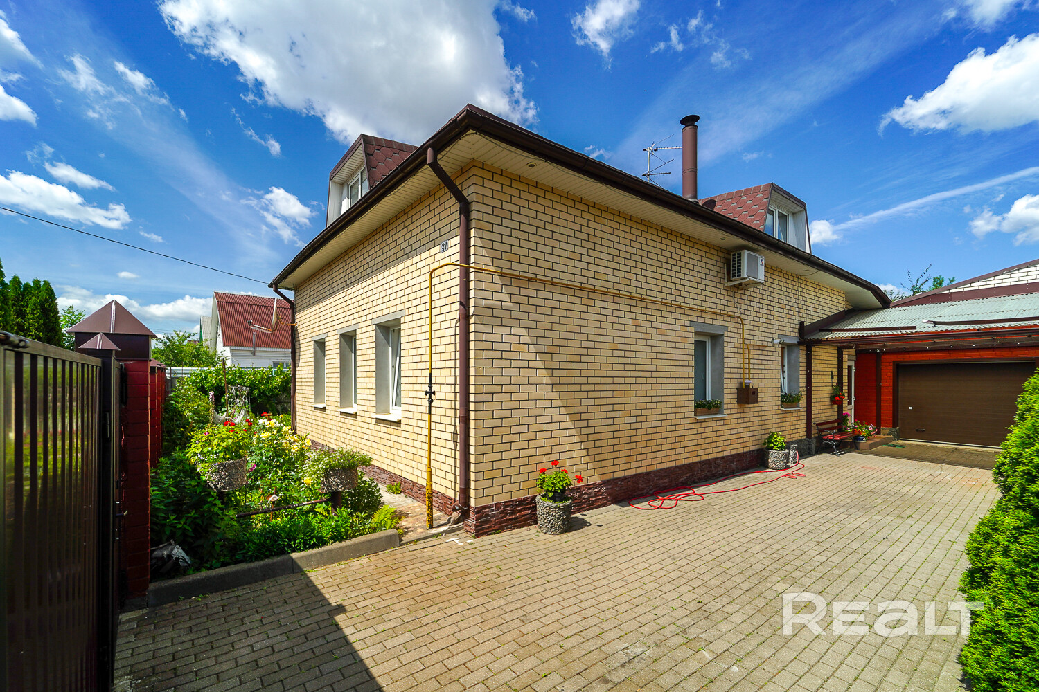 В доме просторная кухня-гостиная 40 кв.м., две спальни, рабочий кабинет, каминная, гостиная игровая, гардеробная. Есть подвал. На участке есть просторный теплый гараж, вход в который обустроен навесом.