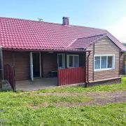 Дом из бруса с двумя пристройками обшит снаружи сайдингом, окна - стеклопакеты ПВХ, крыша - металлочерепица. На полу в доме частично плитка, частично доска, покрытая ДВП.