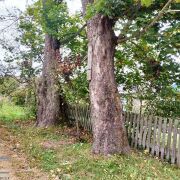На ровном прямоугольном участке имеются хозпостройки - сарай, погреб, баня, кирпичный гараж. Растет большой фруктовый сад. Огражден участок деревянным забором.