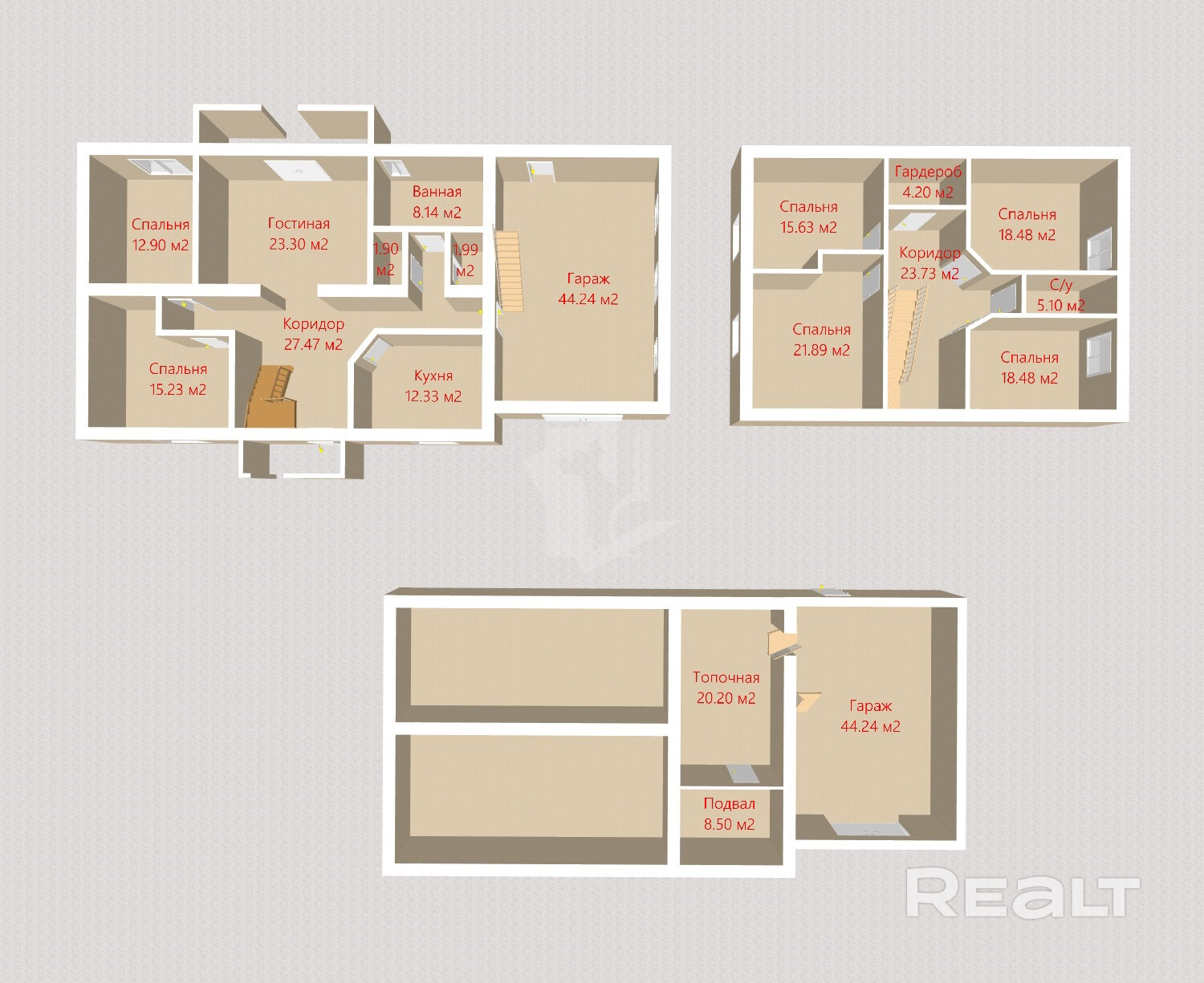 на 1 этаже – коридор, кухня, гостиная, 2 спальни, ванная, душевая, санузел, гараж, подвальное помещение с топочной;