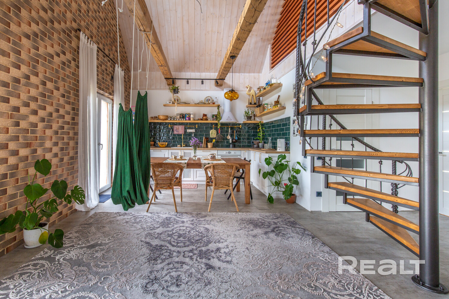 Стильная кованая лестница ведет на мансардный этаж, где вы найдете тихий уголок для отдыха и созерцания.