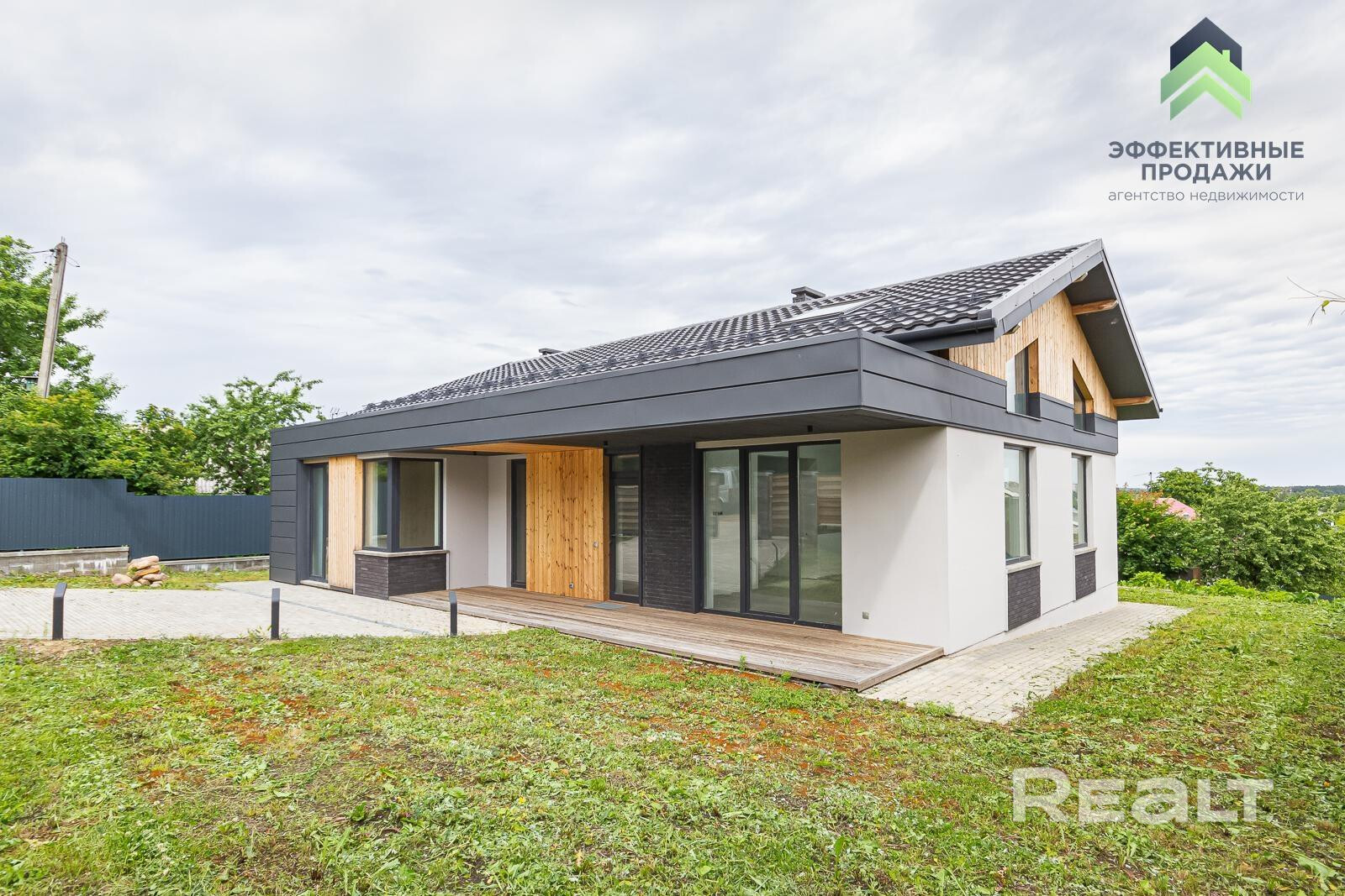 Введен в эксплуатацию в 2022 году, сделан из газосиликатных блоков 400 мм, утеплен. Отделка фасада - декоративная штукатурка с дополнением элементов из натурального дерева. Фундамент: свайно-ростверковый, монолитная плита.