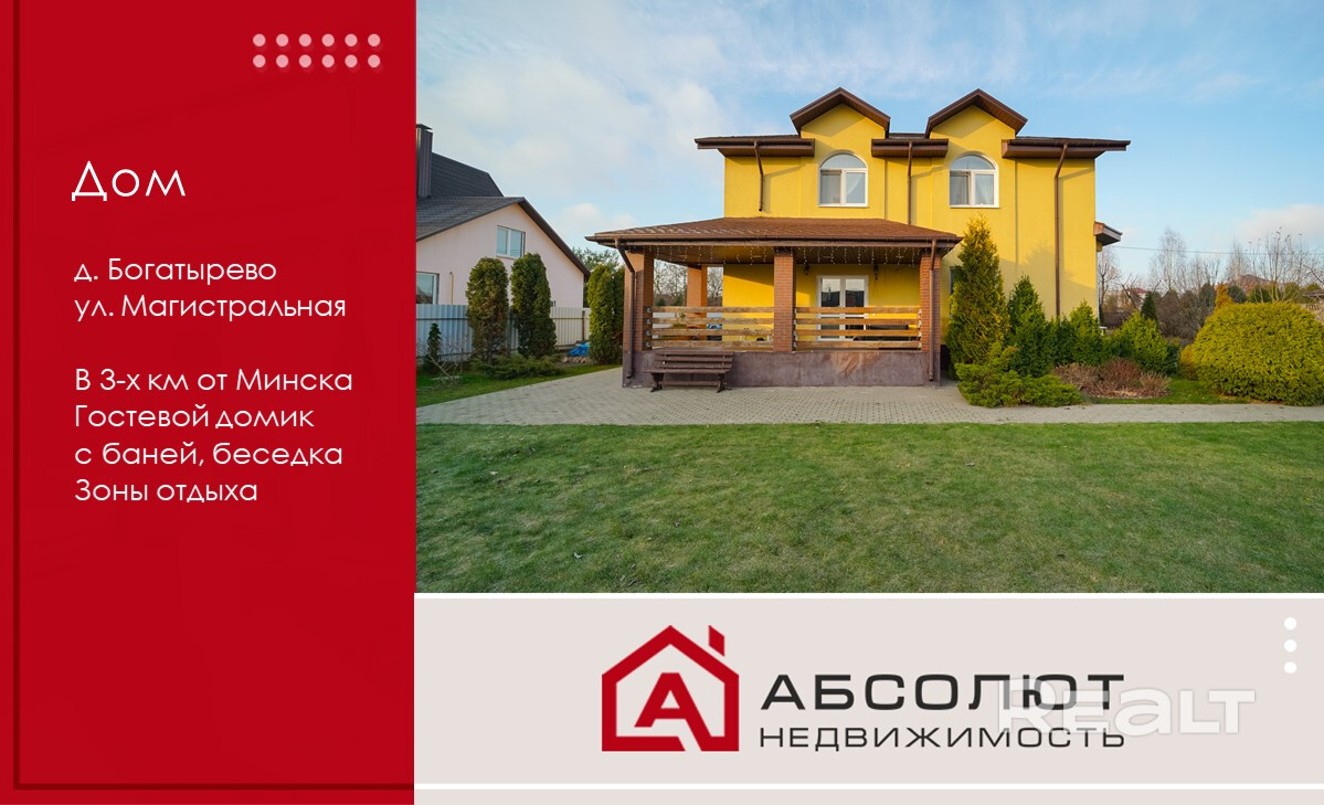 Продается уютный двухэтажный дом с гостевым домиком, баней и благоустроенной беседкой в живописной деревне Богатырёво, всего в 3 км от Минска.