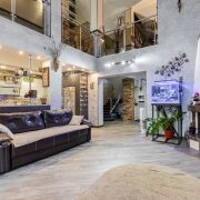 Гараж, отапливаемый с ямой и водоснабжением имеет прямой выход в дом. Оборудован верстаками, дистанционно управляемыми воротами