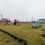 У участка детский игровой комплекс с качелями и горкой, волейбольная площадка