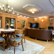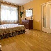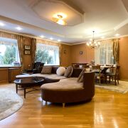 Напольное покрытие на первом этаже паркет(гостиная) и плитка (кухня, зимний сад, постирочная, санузлы). Второй этаж ламинат. На третьем этаже паркет (кабинет, гардеробная), в спальне ковровое покрытие и в санузле плитка.