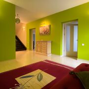 Стены первого этажа декоративная штукатурка с элементами ручной росписи на кухне и в холле. Второй этаж декоративна штукатурка. Спальня 3 этажа обои, кабинет штукатурка.