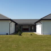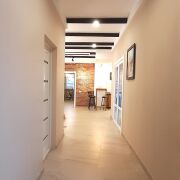 Состоит из 2-х автономных, в плане коммуникаций, половин. Утеплен, оштукатурен, в отделке дома использованы качественные материалы. Правая половина дома готова к проживанию. Просторная кухня-гостиная (45,6кв.м.) отапливается теплым полом. Кухонный гарнитур со встроенной техникой, остается новому владельцу. С кухни-гостиной можно попасть на уютную террасу – общую для двух половин дома. В двух комнатах (по 13,4кв.м.) правой половины сделан ремонт и они так же готовы к проживанию. Два гаража удобно встроены в дом, имеют независимые входы с жилых помещений.