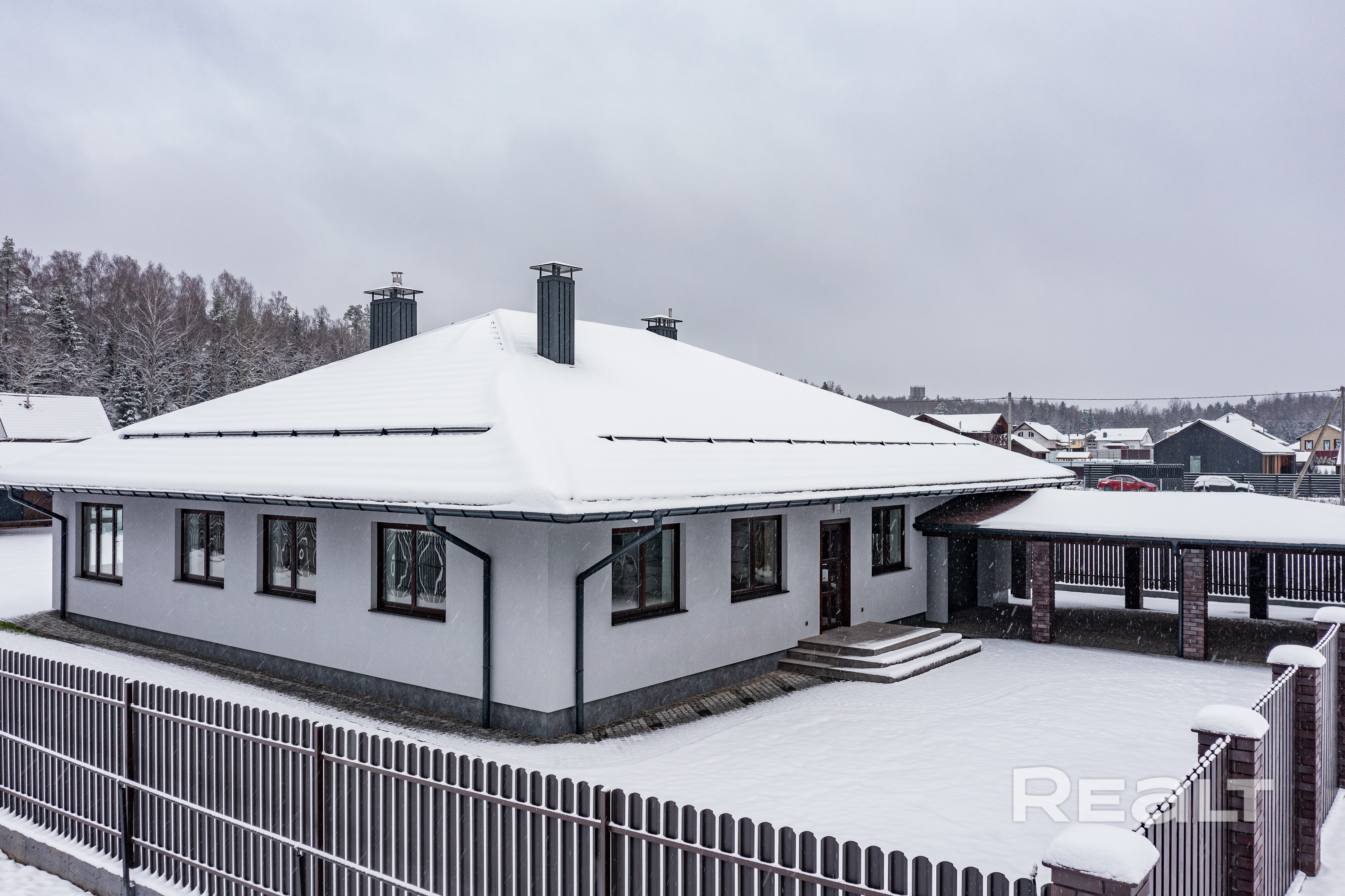 Продаётся новый, готовый к заселению, лаконичный коттедж премиум-класса, из дорогих строительных и отделочных материалов. Логойское направление, 17 км от границ г. Минска, 800 метров до озера «Вяча», прекрасный лесной массив. Жилая современная застройка. Дом построен по индивидуальному дизайн-проекту. Рациональная, продуманная планировка, большой вынос крыши, гараж 34,7м2 с подъемными воротами, навес на 2 машины, летний домик с навесом и зоной «барбекю», площадка с водоотводом под бассейн.