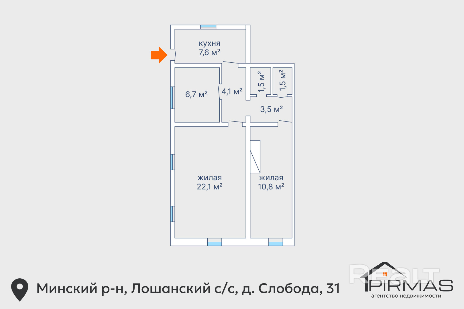 - Дополнительные помещения: комната 6,7 кв.м., две кладовые (по 1,5 кв.м.), коридоры (4,1 кв.м. и 3,5 кв.м.).