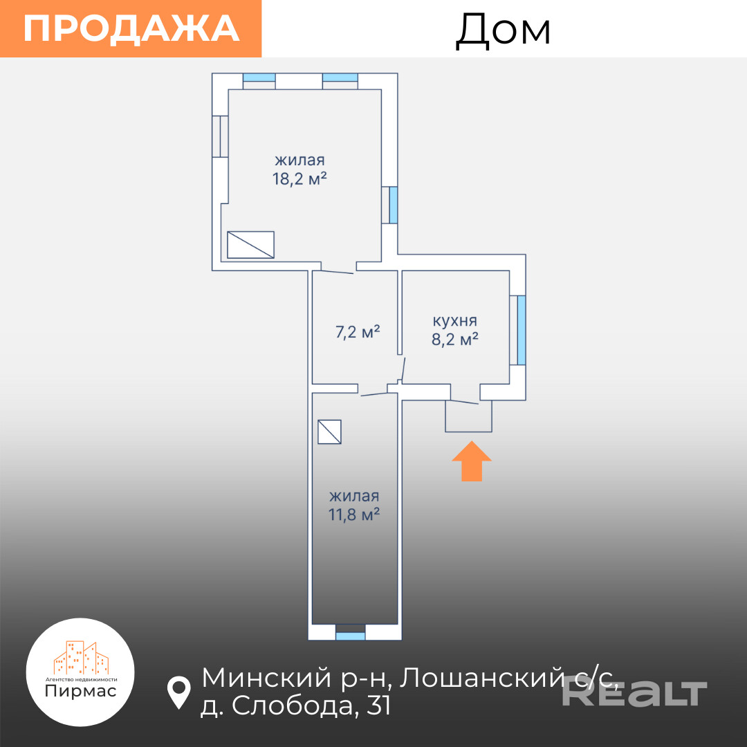 ✅ Предлагается к продаже 50% доли в одноэтажном бревенчатом доме, обложенном кирпичом, расположенном по адресу: Минская область, Минский район, Лошанский сельсовет, деревня Слобода. Общая площадь дома составляет 103,2 кв.м., разделенного на две отдельные квартиры. К продаже предлагается квартира №2 площадью 45,4 кв.м., включающая две жилые комнаты (18,2 кв.м. и 11,8 кв.м.), кухню (8,2 кв.м.) и коридор (7,2 кв.м.). Дом расположен на участке площадью 12.5 соток, находящемся в пожизненном наследуемом владении.