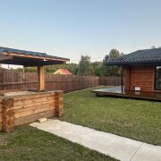 Территорию дополняет большой домик с баней и бассейном (все подготовлено, но не наполнен), зоной отдыха с печью и глубоким просторным подвалом. В бане установлен котел на 9 кВт. Также в бане в наличии 2 печи, одна из них с функцией готовки на живом огне. Баня отапливается по системе "теплый пол".