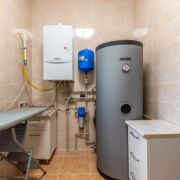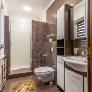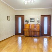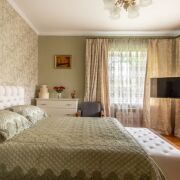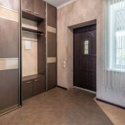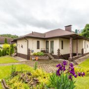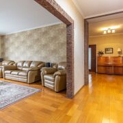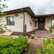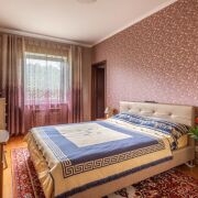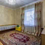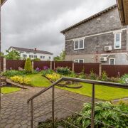 1-ый уровень — жилая зона. Прихожая ведет в просторный холл, объединяющий 5 изолированных комнат: большую гостинную, 2 спальни с санузлами, еще 2 комнаты, которые могут быть использованы как детские или как гостевая и кабинет. На этом уровне находятся также просторная кухня с выходом во внутренний двор, гостевой санузел и котельная+прачечная. Второй уровень в цокольном этаже обустроен как хозяйственная зона (кладовки, подсобные помещения) и зона отдыха (баня с парилкой,большая душевая, кухня, санузел). С этого уровня есть два выхода : в жилую зону и во внутренний двор. Участок благоустроен и огорожен с трех сторон столбиками из бессеровских блоков и металлопрофиля, а с фасада — авторской декоративной ковкой.