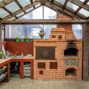 На крытой и вымощенной плиткой площадке устроена летняя зона отдыха с печкой-коптильней, плитой, духовкой, обеденной зоной.
