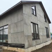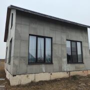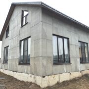 Дом построен по новой технологии с использованием СИП панелей. Панели состоят из двух ориентированных стружечных плит ОСП, между которыми под давлением приклеивается слой твердого пенополистирола в качестве утеплителя.