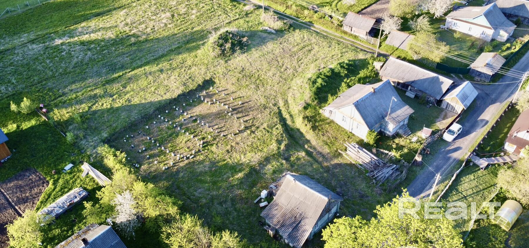Участок г-образной формы с правильными углами, ровный, с асфальтированным подъездом. Статус участка – пожизненно наследуемое владение. На участке зарегистрирован старый жилой дом и начато строительство (разработан проект, сделана геодезия, построен фундамет из 74 свайно-забивных свай) нового.