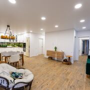 Качественная и современная отделка с использованием натуральных и долговечных материалов. В интерьере преобладают теплые оттенки, деревянные элементы и продуманное освещение, создающее уютную атмосферу. Просторная кухня-гостиная оснащена современной техникой, стильной мебелью и полностью готова к использованию.