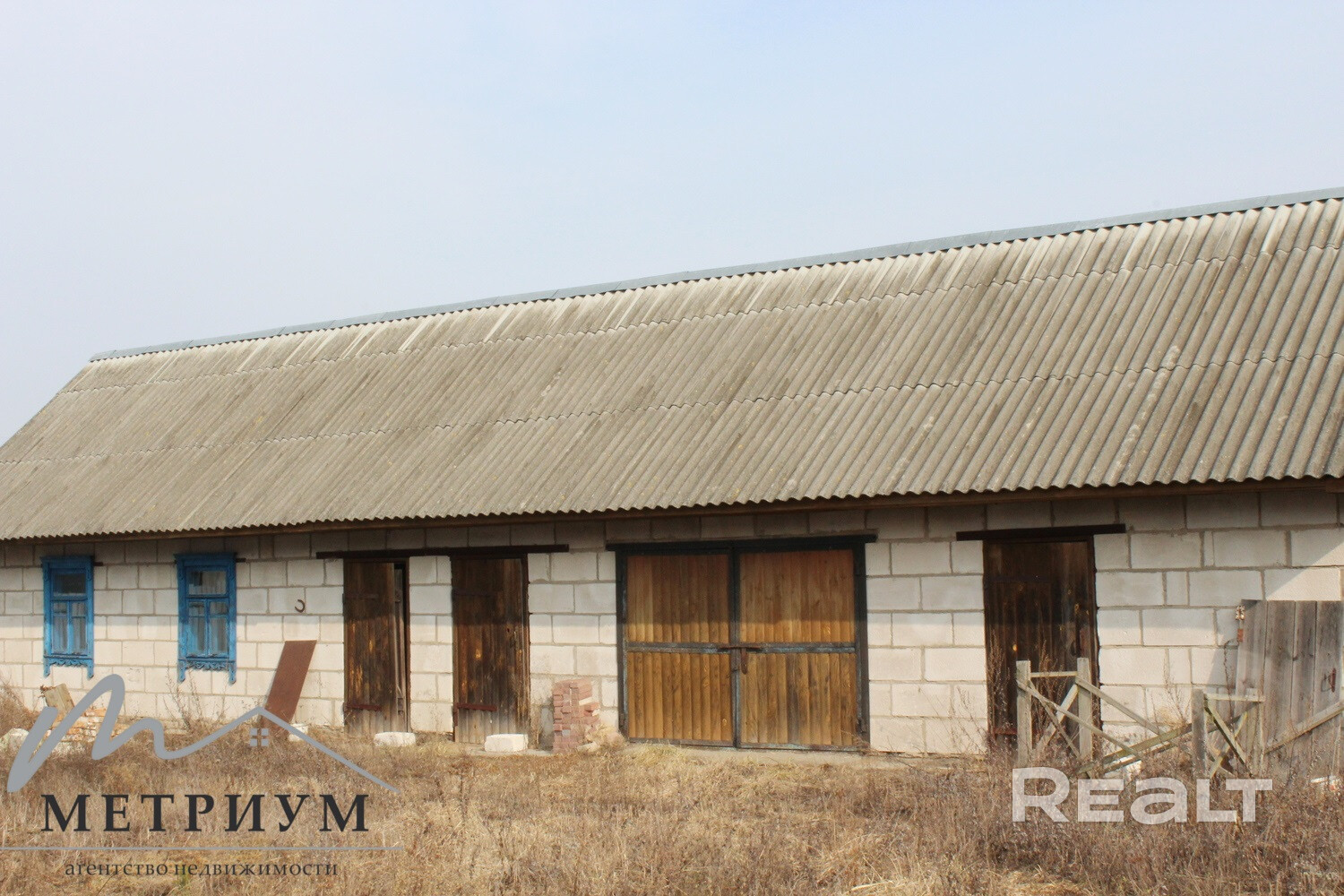 За домом есть большая хоз. постройка, внутри которой гараж, большая комната, малая комната, большой погреб. Есть возможность сделать там баню.