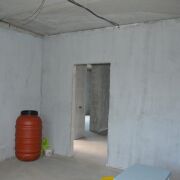 Внутренние стены оштукатерены под маяки (далее они были удалены); пол - утеплен пеноплексом 50 мм - далее смонтирована чистовая стяжка; разведена вся необходимая проводка по дому - включающая в себя: освещение, розетки, точечные светильники, проходной свет, под радиаторы, проведён кабель для плиты и духовой печи - предусмотрена каждая мелочь, которая нужна для комфортной жизни в доме.