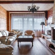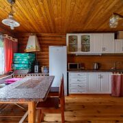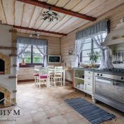 На 1-ом этаже расположена гостиная с камином на дровах и кухня-столовая с русской печью, жилая комната, топочная, 2 санузла. Из гостиной выход на просторную террасу.