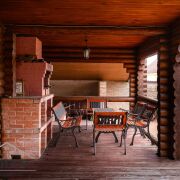 На участке отдельно стоящая баня из бруса, с кухней, зоной отдыха, на втором этаже просторная комната с камином. Может использоваться как гостевой дом.