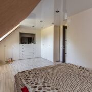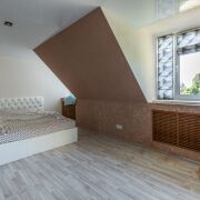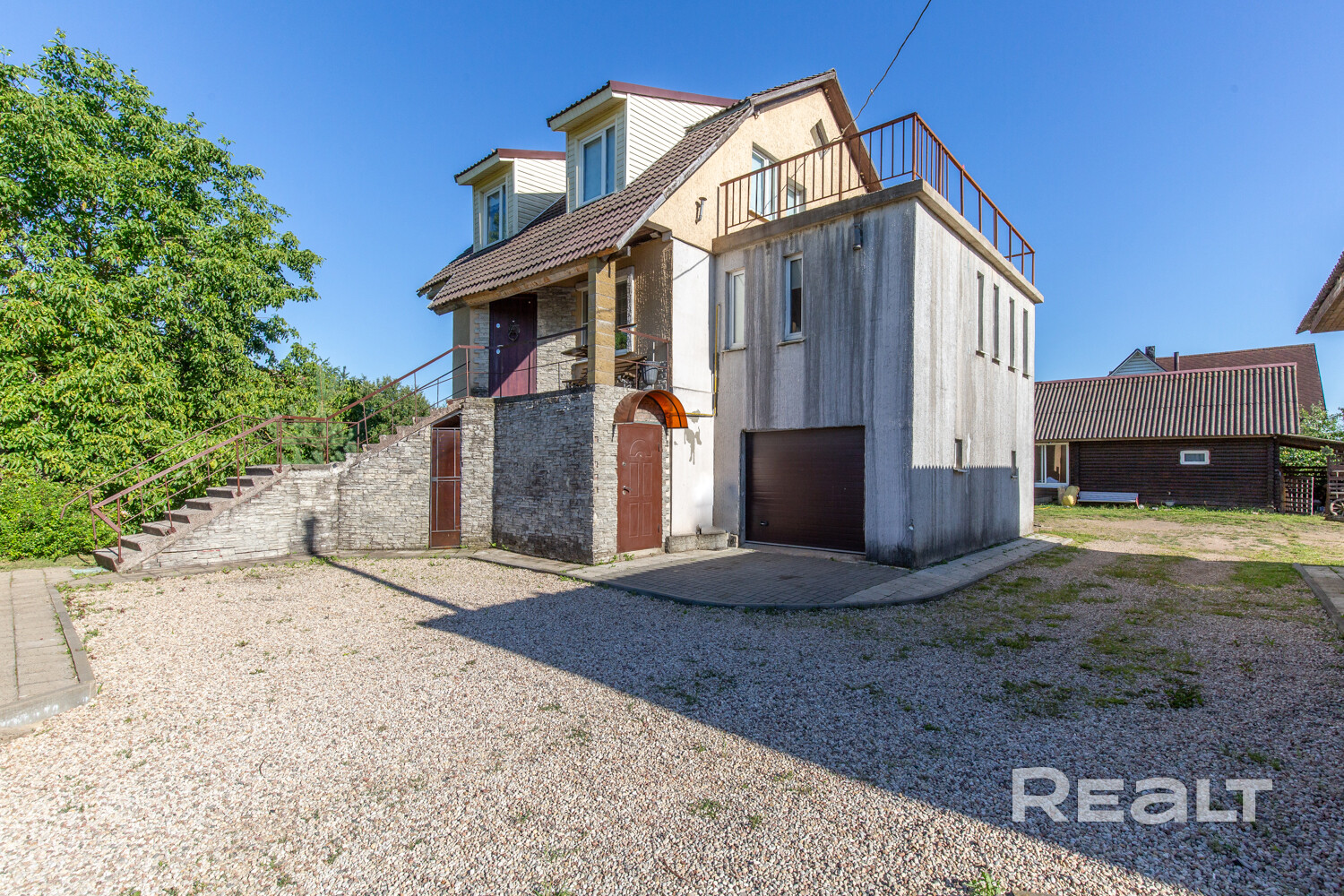 Дом очень компактный, три уровня, с выходом на террасу со второго этажа, на верхнем уровне мансардные окна.