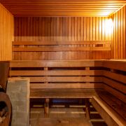 Баня деревянная, отдельное строение, парная и просторная комната отдыха с французскими окнами.