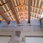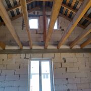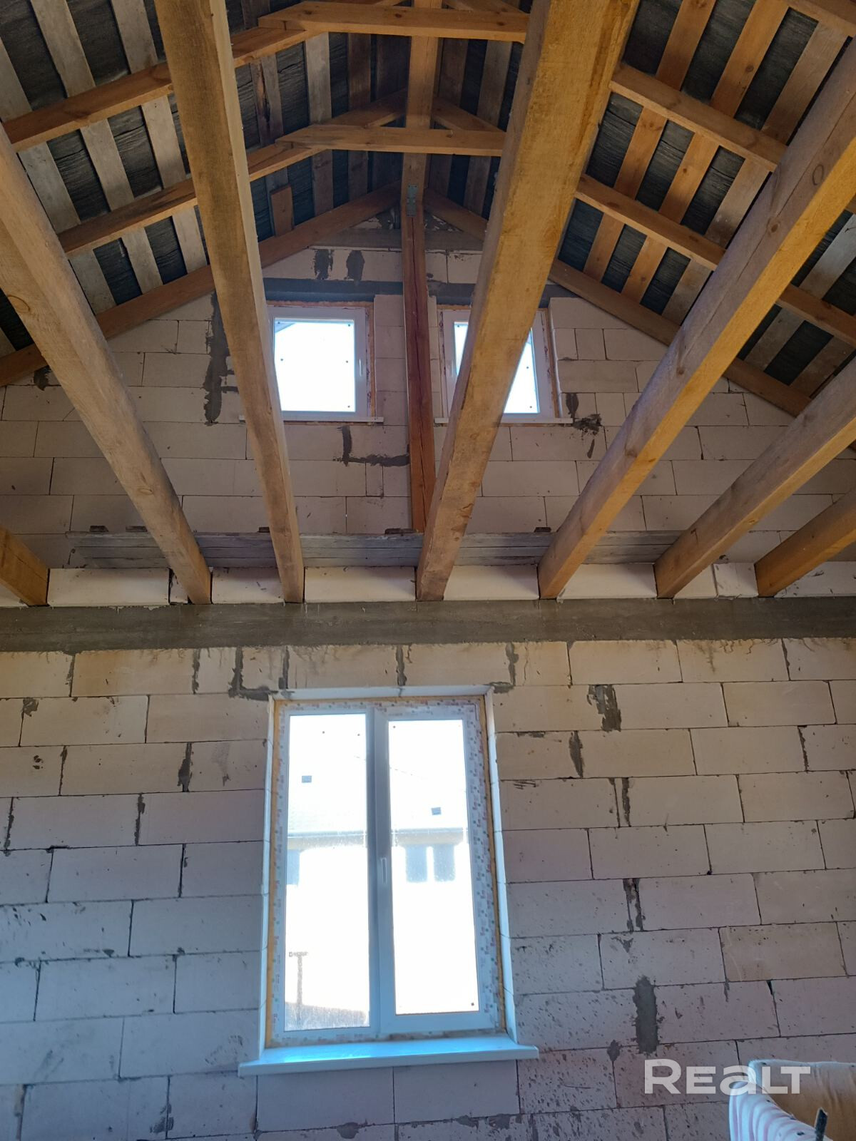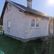 Материал дома – газосиликатные блоки. Фундамент ленточный. Крыша шифер. Окна стеклопакеты KBE. Газ рядом с участком. В доме частично произведена разводка под электричество (2200 В., 380 В). Залита стяжка. Входная дверь деревянная, есть межкомнатные двери.
