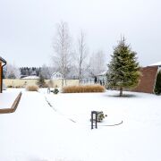 - Дорожки вымощены плиткой, на участке множество композитных насаждений.