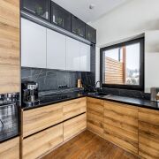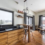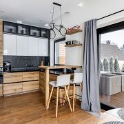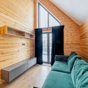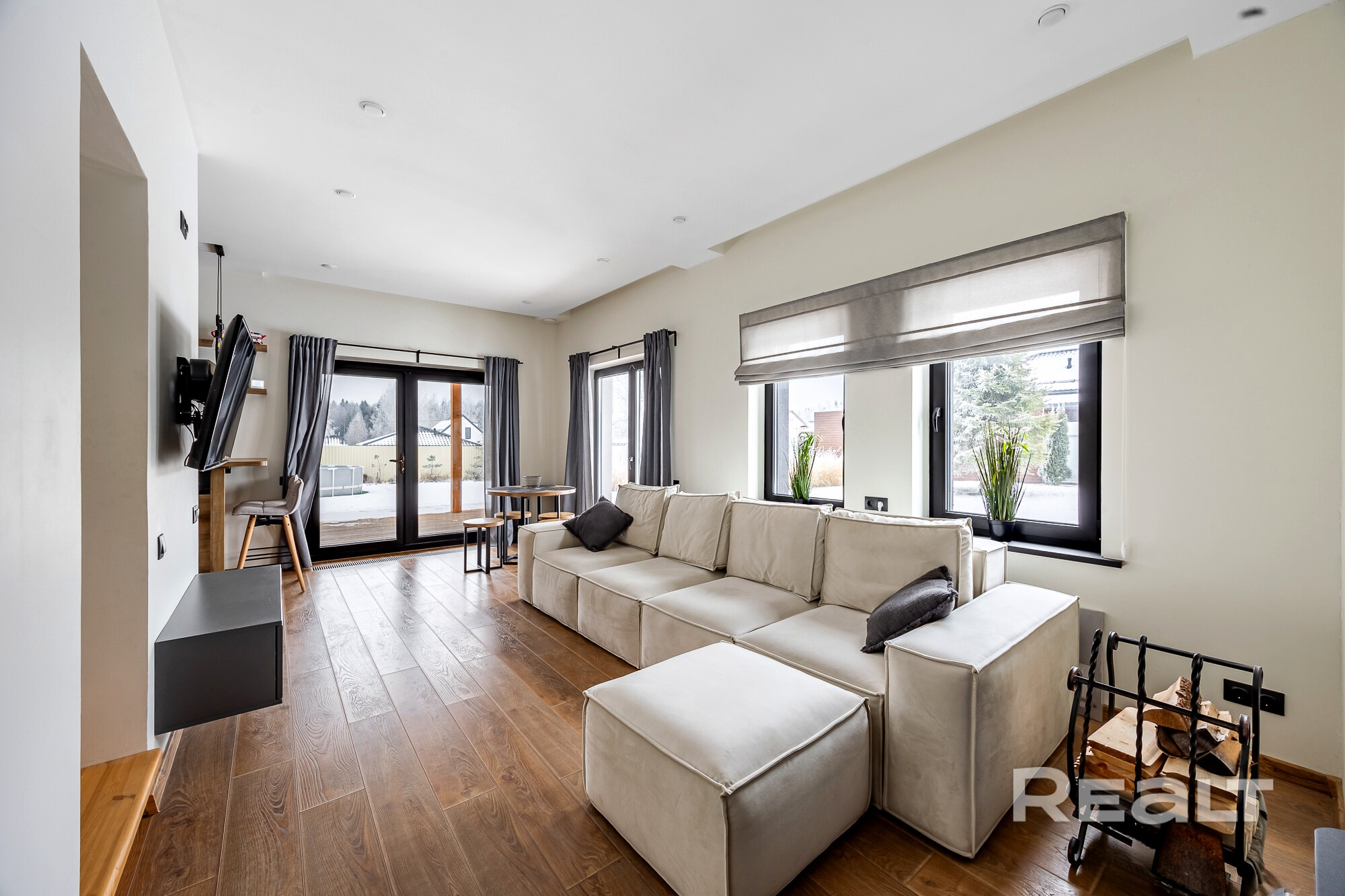 1 этаж - просторная кухня - гостиная с высотой потолка до 8 метров и панорамными окнами, санузел, прачечная.