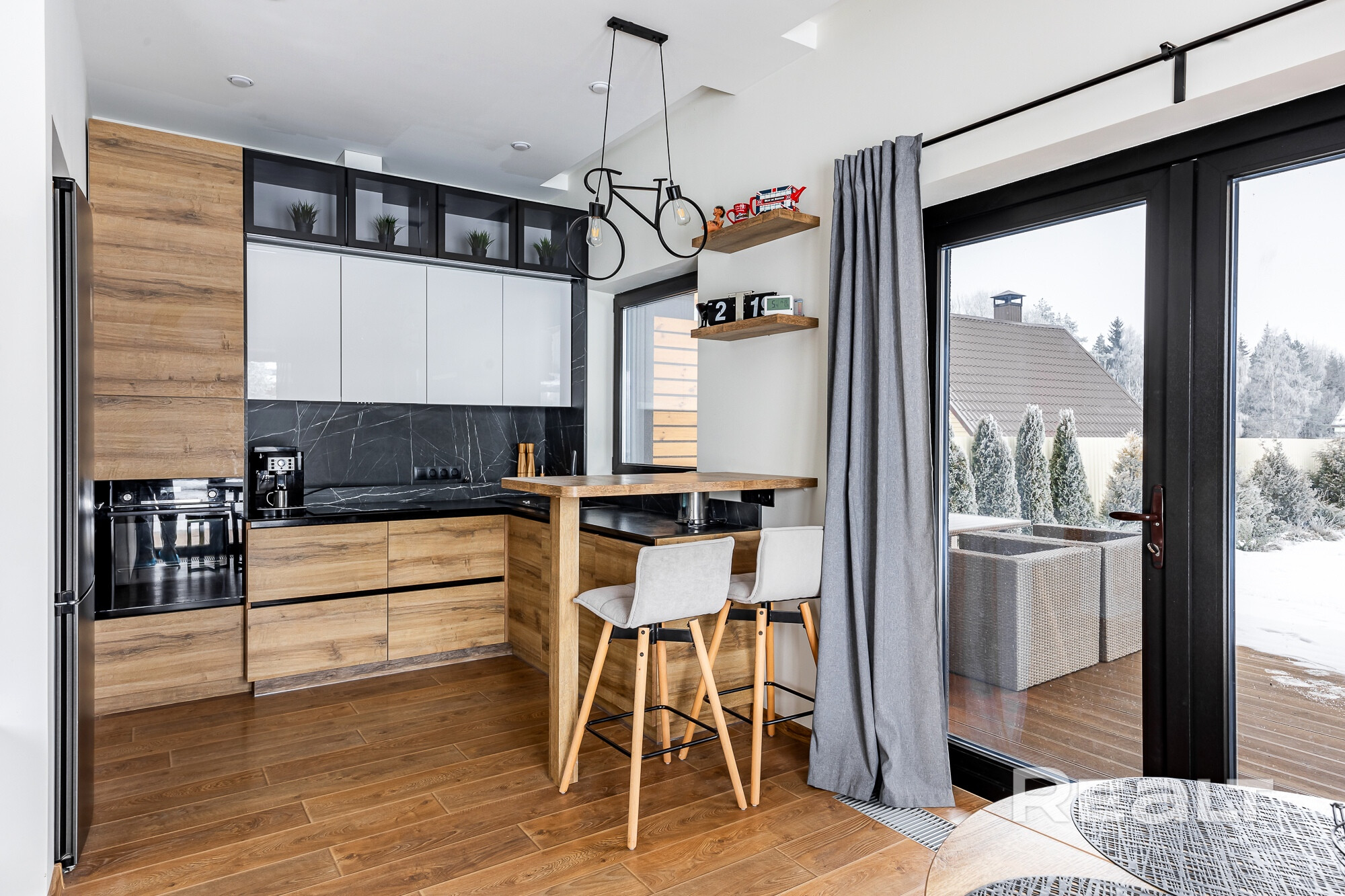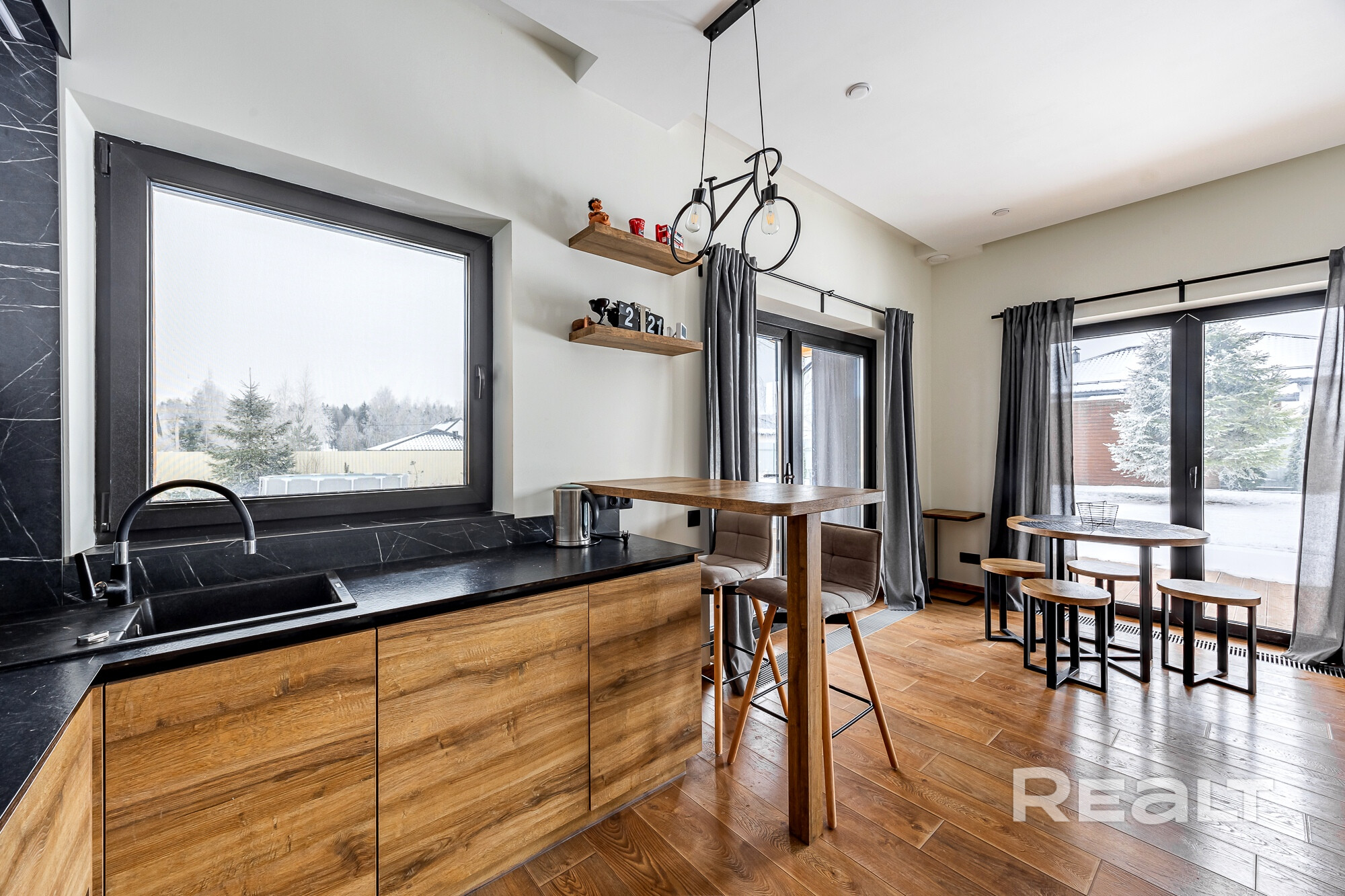 1 этаж - кухня-гостиная с панорамными окнами и выходом на террасу. Финская баня. Ведро-водопад и душевая с выходом на улицу. Санузел, прачечная, топочная.