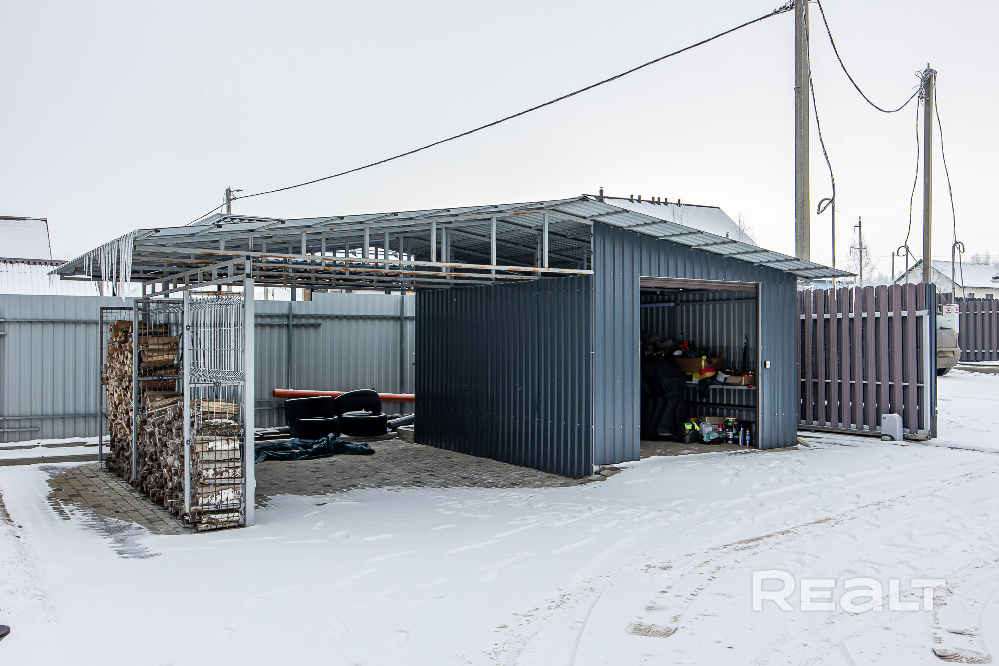 - Огорожен забором-жалюзи, откатные, распашные ворота.