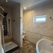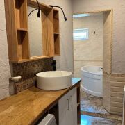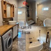 Кол-во санузлов - 2 (1 этаж (большая ванна, душ, унитаз, умывальник), 2 этаж (унитаз, умывальник)).