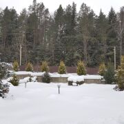 - пруд с водопадом (оборудована система очистки воды), туи, цветы, вишня, сливы, абрикосы, груши, яблони, черешня;