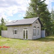 Гостевой домик в юго-западном углу участка полезной площадью около сорока квадратных метров. Создан по индивидуальному проекту. Крыша металлическая, утеплённая. Деревянный полуэтаж с лестницей, панорамные окна. Окно-люк с выходом на крышу. Полноценная кухня с индукционной плитой. Пол с электрическим подогревом в северной половине площади. Запроектировано пожаробезопасное место возле двери под дровяную печь или декоративный камин.Под лестницей оборудован кронштейн для подвесного кресла и место для холодильника.