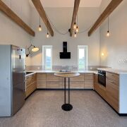 Стены (блок 400 мм + 100 мм минваты) и крыша (утепление 250 мм) обеспечивают превосходную теплоизоляцию, что приводит к заметному снижению счетов за отопление и стабильно комфортной температуре круглый год. Важная особенность — система вентиляции с рекуперацией тепла, которая подает постоянный свежий, отфильтрованный воздух — значительное преимущество для людей с аллергией. В дополнение к чистому воздуху, водоснабжение осуществляется из собственной скважины, и вода проходит через систему фильтрации, что дает вам полный контроль над ее качеством и чистотой.