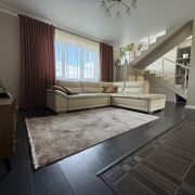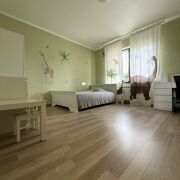 На первом этаже терраса, большая кухня 22,4 кв.м, гостиная 34.7 кв.м., топочная,санузел. Второй этаж состоит из трех изолированных комнат, родительская спальня 22,2 кв.м и две детских по 16 кв.м., а также большой санузел 8.5 кв.м. с окном.