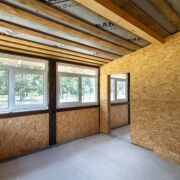 · Второй этаж построен по каркасной технологии: вертикальные стены — 200 мм, утеплитель, пароизоляция и внешняя гидроизоляция.