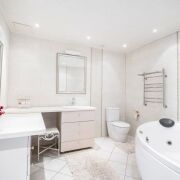 2 этажа, на каждом этаже есть санузел с душевой кабиной или ванной, есть отдельное помещение для стиральной машины. На первом этаже - джакузи. В доме четыре изолированные просторные комнаты, большая кухня-столовая почти на 50 м2.