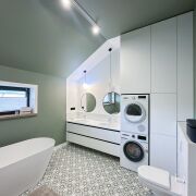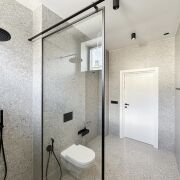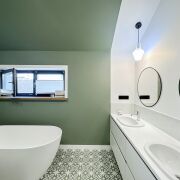 • Ванная комната — тёплый терраццо, акцентная зелёная плитка ручной формовки, сантехника премиум-класса